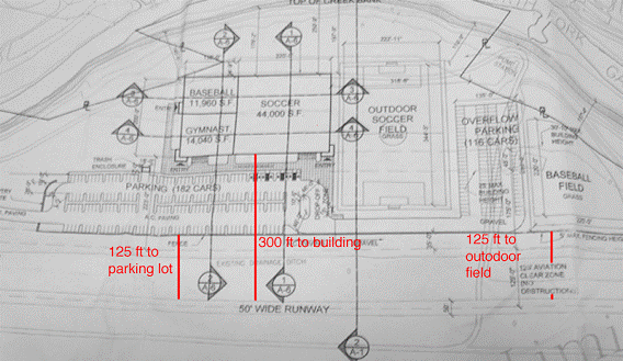 In addition to the obvious hazard created by the main building which will be 41 feet above grade[7] at its tallest point, the outdoor parking lot, soccer field and baseball field are of serious concerns. The parking lot is only 125 feet from the runway and the 36 (average) foot tall, 85,000 square foot building is proposed for 300 feet from the runway.