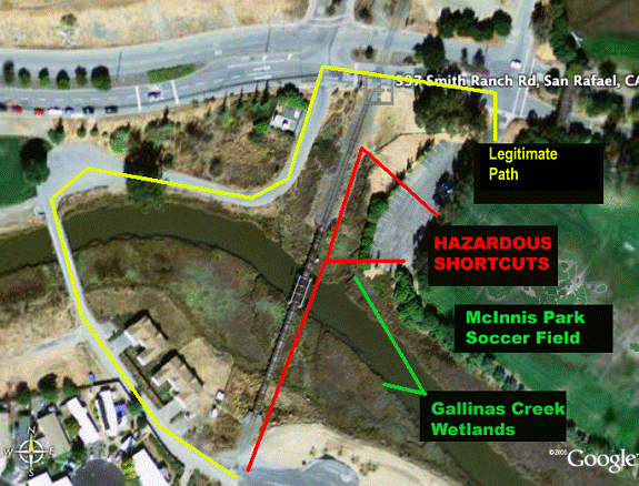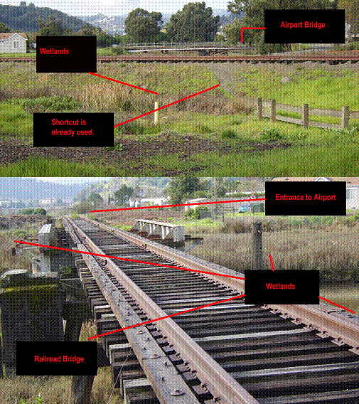 DANGEROUS SHORTCUTS OVER RAILROAD BRIDGE AND WETLANDS |